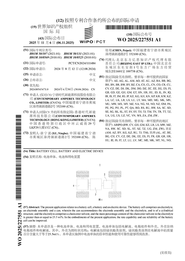 证券之星消息,根据企查查数据显示宁德时代(300750)公布了一项国际专利申请,专利名为“电池单体、电池和用电装置”,专利申请号为PCT/CN2024/111484,国际公布日为2025年11月6日。