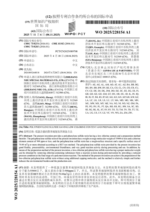 证券之星消息,根据企查查数据显示新 和 成(002001)公布了一项国际专利申请,专利名为“低氯含量的聚苯硫醚及其制备方法”,专利申请号为PCT/CN2025/089708,国际公布日为2025年11月6日。