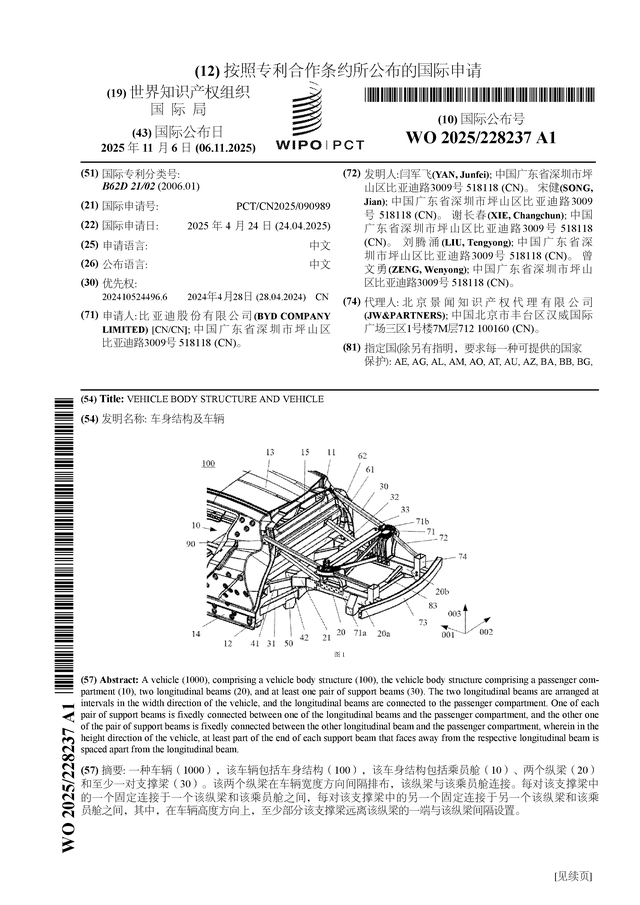 证券之星消息,根据企查查数据显示比亚迪(002594)公布了一项国际专利申请,专利名为“车身结构及车辆”,专利申请号为PCT/CN2025/090989,国际公布日为2025年11月6日。