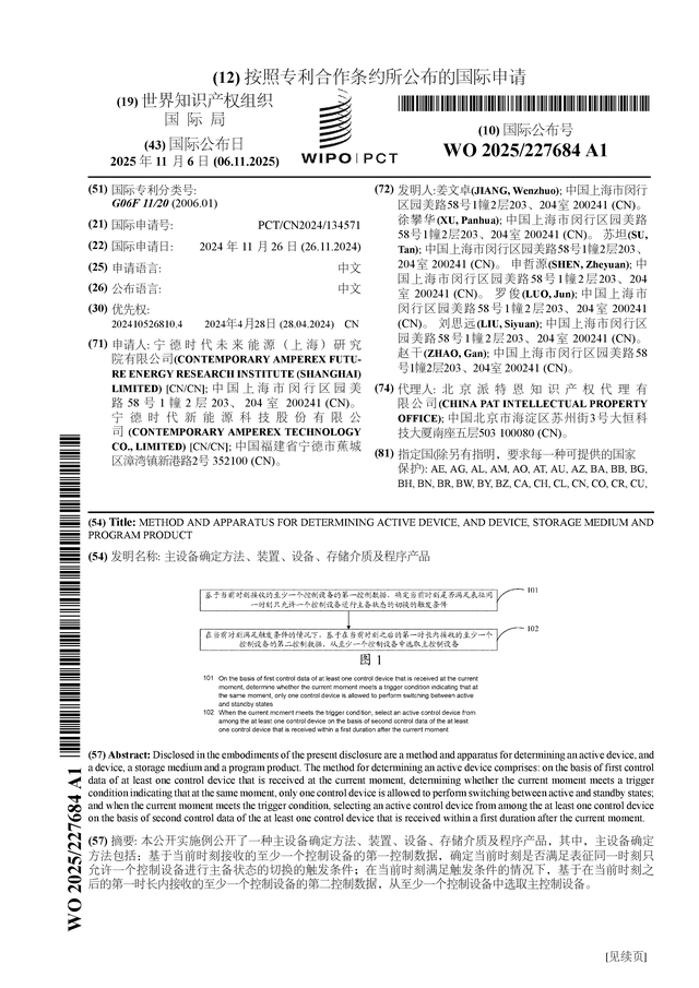 证券之星消息,根据企查查数据显示宁德时代(300750)公布了一项国际专利申请,专利名为“主设备确定方法、装置、设备、存储介质及程序产品”,专利申请号为PCT/CN2024/134571,国际公布日为2025年11月6日。