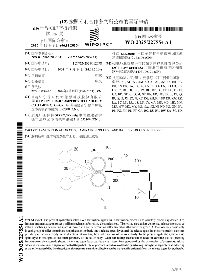 证券之星消息,根据企查查数据显示宁德时代(300750)公布了一项国际专利申请,专利名为“叠片装置及叠片工艺、电池加工设备”,专利申请号为PCT/CN2024/112098,国际公布日为2025年11月6日。