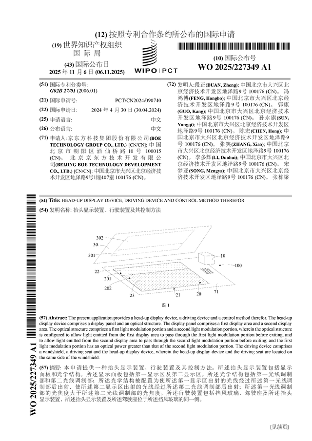 证券之星消息,根据企查查数据显示京东方A(000725)公布了一项国际专利申请,专利名为“抬头显示装置、行驶装置及其控制方法”,专利申请号为PCT/CN2024/090740,国际公布日为2025年11月6日。