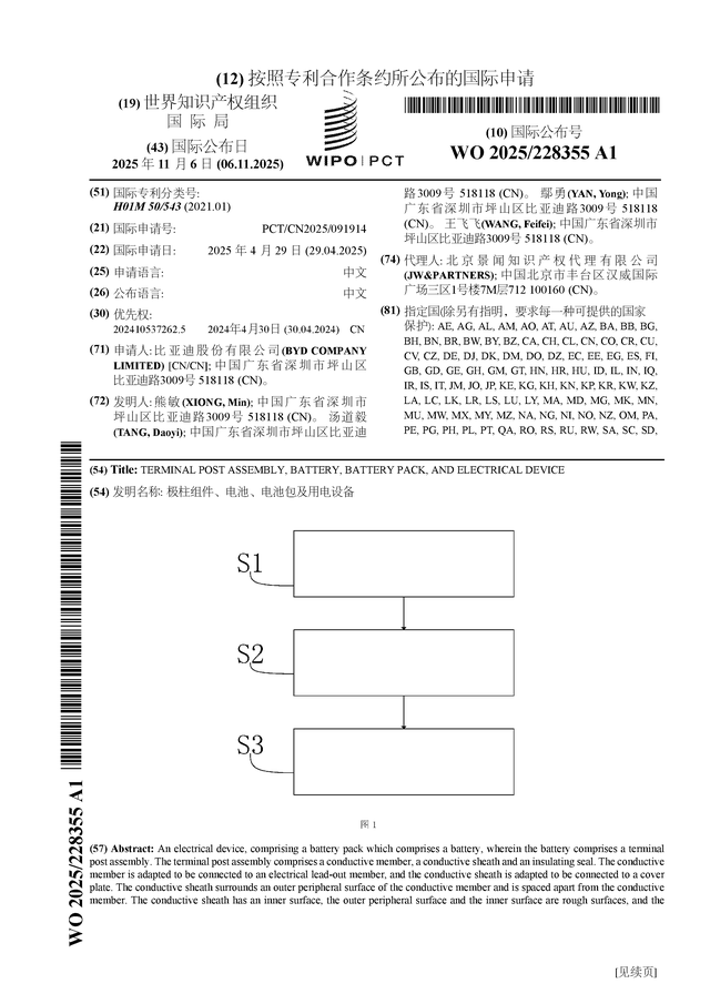 证券之星消息,根据企查查数据显示比亚迪(002594)公布了一项国际专利申请,专利名为“极柱组件、电池、电池包及用电设备”,专利申请号为PCT/CN2025/091914,国际公布日为2025年11月6日。