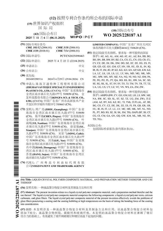 证券之星消息,根据企查查数据显示金发科技(600143)公布了一项国际专利申请,专利名为“一种液晶聚合物复合材料及其制备方法和应用”,专利申请号为PCT/CN2025/090463,国际公布日为2025年11月6日。