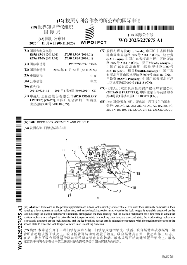 证券之星消息,根据企查查数据显示比亚迪(002594)公布了一项国际专利申请,专利名为“门锁总成和车辆”,专利申请号为PCT/CN2024/133866,国际公布日为2025年11月6日。