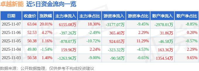 证券之星消息,截至2025年11月7日收盘,卓越新能(688196)报收于63.04元,上涨20.01%,涨停,换手率4.67%,成交量5.61万手,成交额3.36亿元。