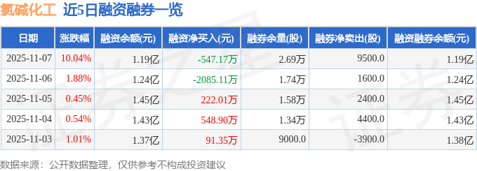 氯碱化工融资融券信息显示,融资方面,当日融资买入609.19万元,融资偿还1156.35万元,融资净偿还547.17万元。融券方面,融券卖出1.1万股,融券偿还1500.0股,融券余量2.69万股,融券余额33.62万元。融资融券余额1.19亿元。