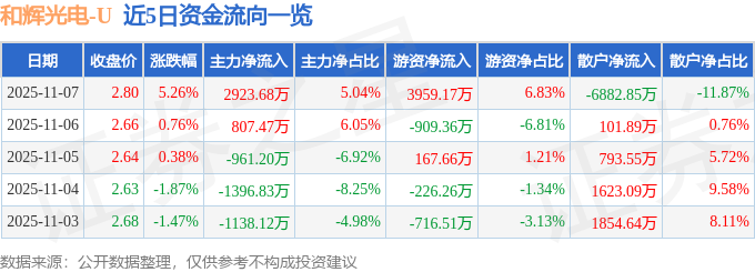 证券之星消息,截至2025年11月7日收盘,和辉光电(688538)报收于2.8元,上涨5.26%,换手率3.59%,成交量206.61万手,成交额5.8亿元。
