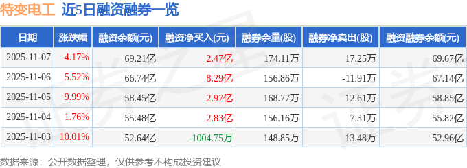 特变电工融资融券信息显示,融资方面,当日融资买入25.0亿元,融资偿还22.53亿元,融资净买入2.47亿元,净买入额两市排名第6,连续3日净买入累计13.74亿元。融券方面,融券卖出21.46万股,融券偿还4.21万股,融券余量174.11万股,融券余额4613.84万元。融资融券余额69.67亿元。