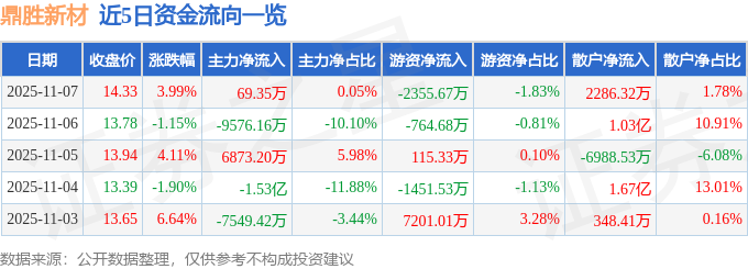 证券之星消息,截至2025年11月7日收盘,鼎胜新材(603876)报收于14.33元,上涨3.99%,换手率9.77%,成交量90.75万手,成交额12.85亿元。