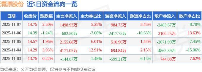 证券之星消息,截至2025年11月7日收盘,清源股份(603628)报收于14.75元,上涨2.5%,换手率7.13%,成交量19.42万手,成交额2.85亿元。