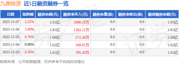 九鼎投资融资融券信息显示,融资方面,当日融资买入2860.97万元,融资偿还1852.77万元,融资净买入1008.19万元,连续3日净买入累计2882.66万元。融券方面,融券卖出0.0股,融券偿还0.0股,融券余量0.0股,融券余额0.0万元。融资融券余额1.91亿元。