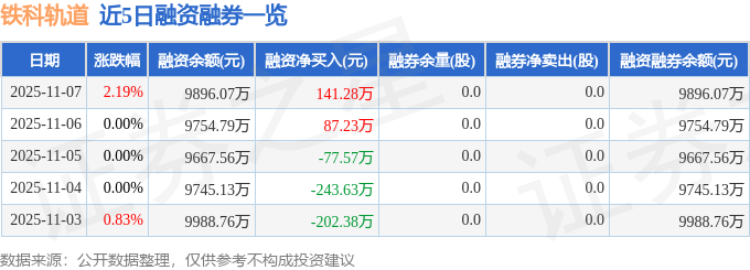 铁科轨道融资融券信息显示,融资方面,当日融资买入612.86万元,融资偿还471.58万元,融资净买入141.28万元。融券方面,融券卖出0.0股,融券偿还0.0股,融券余量0.0股,融券余额0.0万元。融资融券余额9896.07万元。