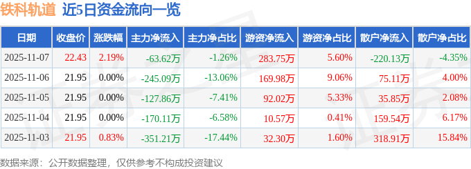 11月7日的资金流向数据方面,主力资金净流出63.62万元,占总成交额1.26%,游资资金净流入283.75万元,占总成交额5.6%,散户资金净流出220.13万元,占总成交额4.35%。