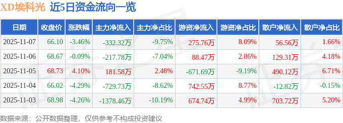 证券之星消息,截至2025年11月7日收盘,XD埃科光(688610)报收于66.1元,下跌3.46%,换手率1.25%,成交量5121.0手,成交额3407.07万元。