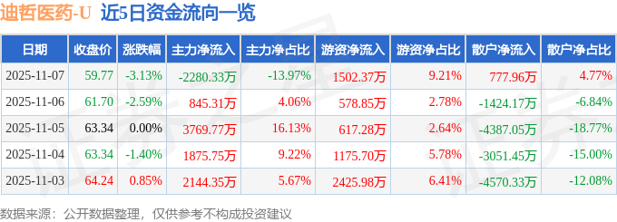 证券之星消息,截至2025年11月7日收盘,迪哲医药(688192)报收于59.77元,下跌3.13%,换手率0.6%,成交量2.7万手,成交额1.63亿元。