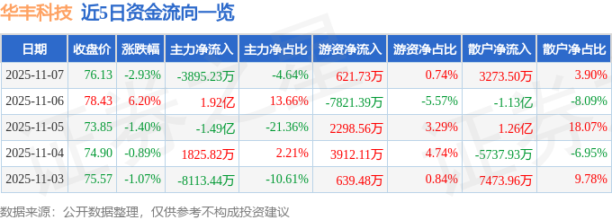 证券之星消息,截至2025年11月7日收盘,华丰科技(688629)报收于76.13元,下跌2.93%,换手率6.03%,成交量10.96万手,成交额8.4亿元。