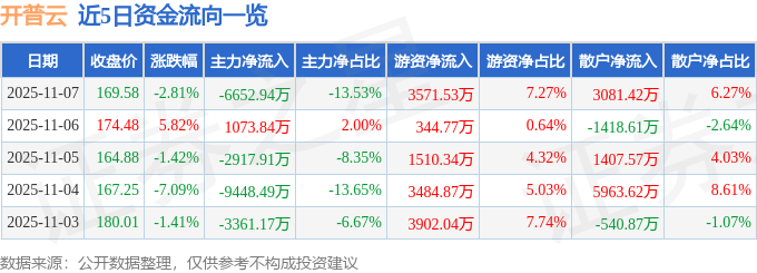 证券之星消息,截至2025年11月7日收盘,开普云(688228)报收于169.58元,下跌2.81%,换手率4.29%,成交量2.9万手,成交额4.92亿元。