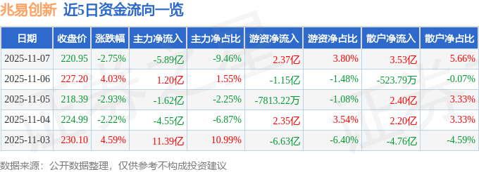 11月7日的资金流向数据方面,主力资金净流出5.89亿元,占总成交额9.46%,游资资金净流入2.37亿元,占总成交额3.8%,散户资金净流入3.53亿元,占总成交额5.66%。
