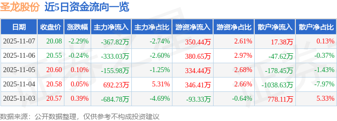 证券之星消息,截至2025年11月7日收盘,圣龙股份(603178)报收于20.08元,下跌2.29%,换手率2.79%,成交量6.6万手,成交额1.34亿元。