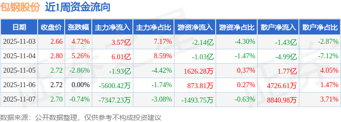 资金流向数据方面,本周包钢股份主力资金合计净流入6.36亿元,游资资金合计净流出3.07亿元,散户资金合计净流出3.29亿元。本周资金流向一览见下表: