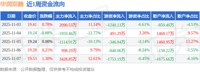 资金流向数据方面,本周华润双鹤主力资金合计净流入3443.3万元,游资资金合计净流出3688.14万元,散户资金合计净流入244.84万元。本周资金流向一览见下表: