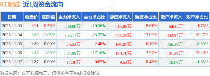 资金流向数据方面,本周ST明诚主力资金合计净流出1563.66万元,游资资金合计净流入1058.38万元,散户资金合计净流入505.27万元。本周资金流向一览见下表: