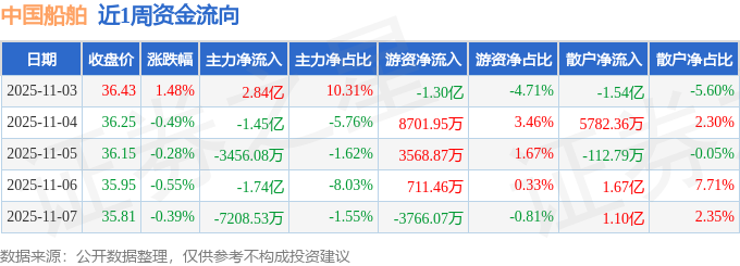 资金流向数据方面,本周中国船舶主力资金合计净流出1.42亿元,游资资金合计净流出3749.15万元,散户资金合计净流入1.8亿元。本周资金流向一览见下表: