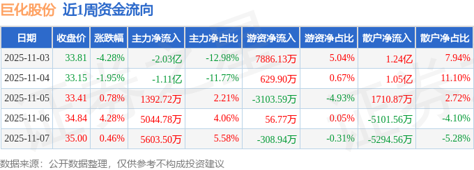 资金流向数据方面,本周巨化股份主力资金合计净流出1.94亿元,游资资金合计净流入5160.27万元,散户资金合计净流入1.42亿元。本周资金流向一览见下表: