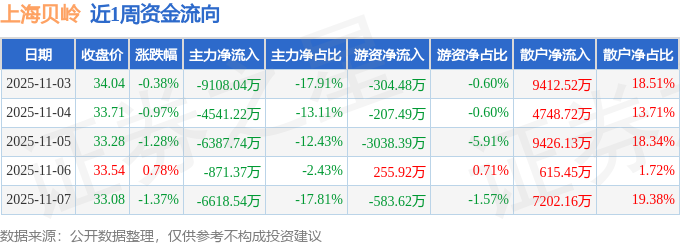 资金流向数据方面,本周上海贝岭主力资金合计净流出2.75亿元,游资资金合计净流出3878.06万元,散户资金合计净流入3.14亿元。本周资金流向一览见下表: