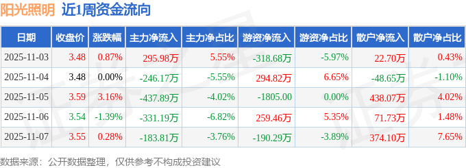 资金流向数据方面,本周阳光照明主力资金合计净流出903.08万元,游资资金合计净流入45.12万元,散户资金合计净流入857.96万元。本周资金流向一览见下表: