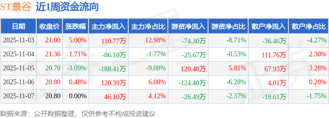 资金流向数据方面,本周ST景谷主力资金合计净流入2.74万元,游资资金合计净流出130.38万元,散户资金合计净流入127.64万元。本周资金流向一览见下表: