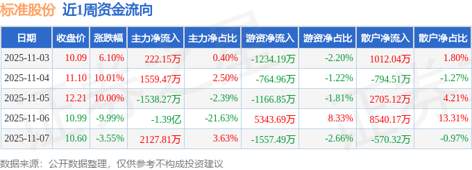 资金流向数据方面,本周标准股份主力资金合计净流出1.15亿元,游资资金合计净流入620.19万元,散户资金合计净流入1.09亿元。本周资金流向一览见下表: