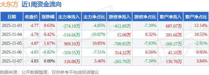 资金流向数据方面,本周大东方主力资金合计净流出55.21万元,游资资金合计净流出1058.3万元,散户资金合计净流入1113.51万元。本周资金流向一览见下表: