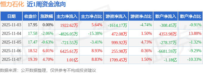 资金流向数据方面,本周恒力石化主力资金合计净流入1.29亿元,游资资金合计净流入1823.27万元,散户资金合计净流出1.47亿元。本周资金流向一览见下表: