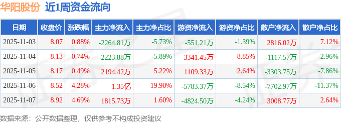 资金流向数据方面,本周华阳股份主力资金合计净流入1.3亿元,游资资金合计净流出6708.3万元,散户资金合计净流出6299.51万元。本周资金流向一览见下表:
