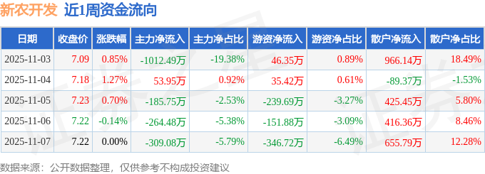 资金流向数据方面,本周新农开发主力资金合计净流出1717.85万元,游资资金合计净流出656.53万元,散户资金合计净流入2374.38万元。本周资金流向一览见下表: