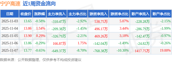 资金流向数据方面,本周宁沪高速主力资金合计净流出1329.13万元,游资资金合计净流入593.75万元,散户资金合计净流入735.38万元。本周资金流向一览见下表: