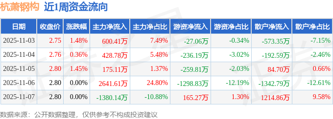 资金流向数据方面,本周杭萧钢构主力资金合计净流入2465.78万元,游资资金合计净流出1656.61万元,散户资金合计净流出809.16万元。本周资金流向一览见下表: