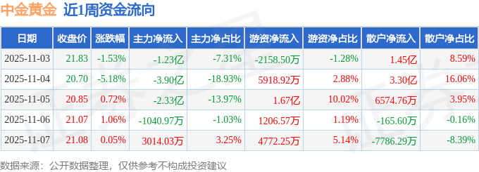 资金流向数据方面,本周中金黄金主力资金合计净流出7.25亿元,游资资金合计净流入2.64亿元,散户资金合计净流入4.61亿元。本周资金流向一览见下表: