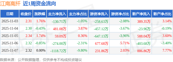资金流向数据方面,本周江南高纤主力资金合计净流出983.27万元,游资资金合计净流出453.34万元,散户资金合计净流入1436.61万元。本周资金流向一览见下表: