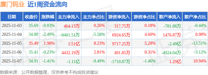 资金流向数据方面,本周厦门钨业主力资金合计净流入488.41万元,游资资金合计净流入1.57亿元,散户资金合计净流出1.62亿元。本周资金流向一览见下表: