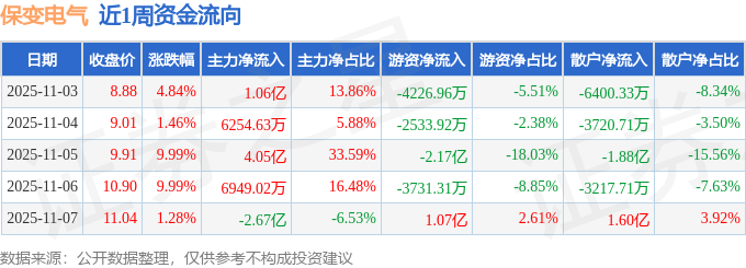 资金流向数据方面,本周保变电气主力资金合计净流入3.76亿元,游资资金合计净流出2.15亿元,散户资金合计净流出1.6亿元。本周资金流向一览见下表: