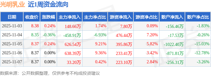 资金流向数据方面,本周光明乳业主力资金合计净流入987.89万元,游资资金合计净流入1336.62万元,散户资金合计净流出2324.51万元。本周资金流向一览见下表: