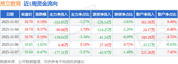 资金流向数据方面,本周昂立教育主力资金合计净流出552.86万元,游资资金合计净流出400.9万元,散户资金合计净流入953.76万元。本周资金流向一览见下表: