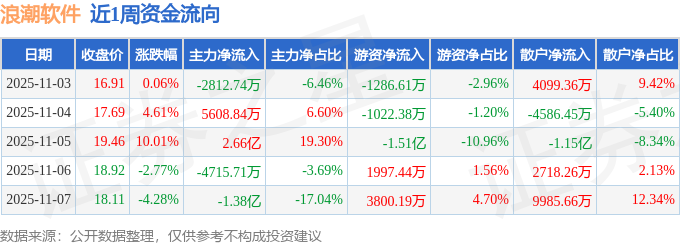 资金流向数据方面,本周浪潮软件主力资金合计净流入1.09亿元,游资资金合计净流出1.16亿元,散户资金合计净流入736.86万元。本周资金流向一览见下表:
