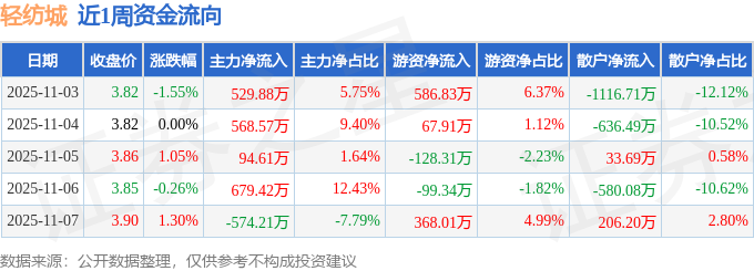 资金流向数据方面,本周轻纺城主力资金合计净流入1298.28万元,游资资金合计净流入795.1万元,散户资金合计净流出2093.38万元。本周资金流向一览见下表: