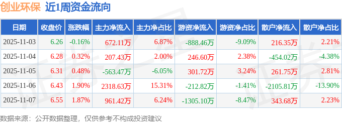 资金流向数据方面,本周创业环保主力资金合计净流入3596.11万元,游资资金合计净流出1858.06万元,散户资金合计净流出1738.05万元。本周资金流向一览见下表:
