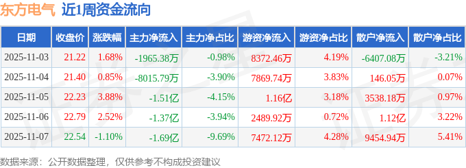 资金流向数据方面,本周东方电气主力资金合计净流出5.57亿元,游资资金合计净流入3.78亿元,散户资金合计净流入1.79亿元。本周资金流向一览见下表: