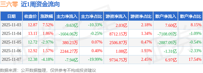 资金流向数据方面,本周三六零主力资金合计净流出17.47亿元,游资资金合计净流入5.21亿元,散户资金合计净流入12.26亿元。本周资金流向一览见下表: